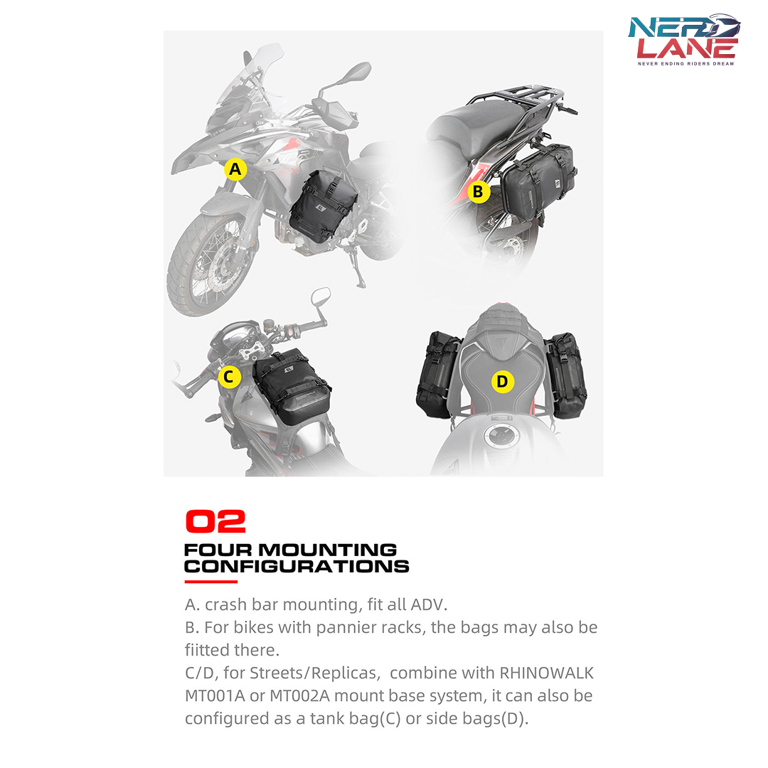 Featuring four innovative mounting configurations, these crash bar bags are adaptable to fit any ADV, pannier racks, or even function as tank or side bags when paired with the Rhinowalk MT001A or MT002A mount base system.