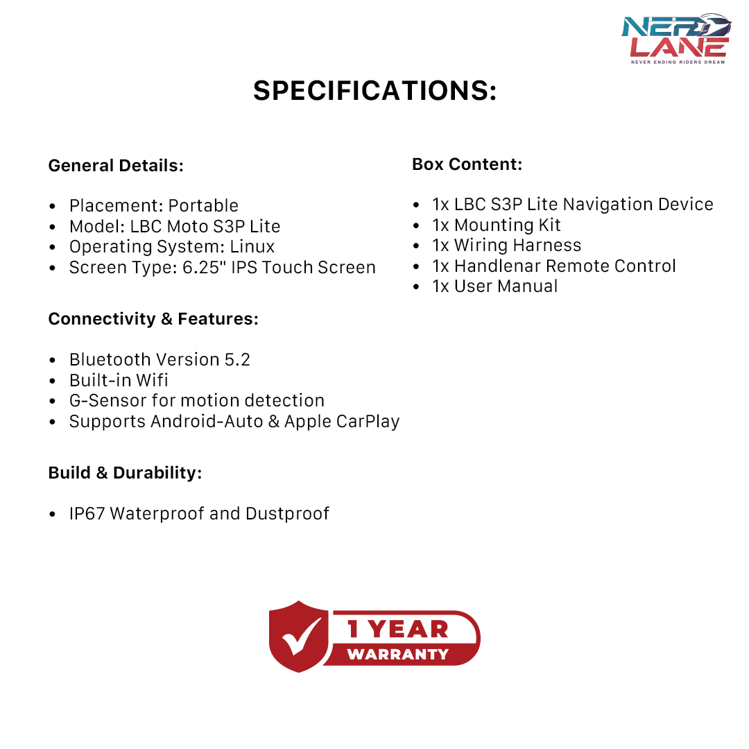 Experience the next level of motorcycle technology with the LBC Moto S3P Elite, a portable, all-in-one rider’s companion built for navigation, safety, and connectivity. Designed for both daily riders and adventure enthusiasts, this cutting-edge device combines GPS navigation, a dual-lens dash camera, and advanced connectivity features, all within a rugged IP67 waterproof body.