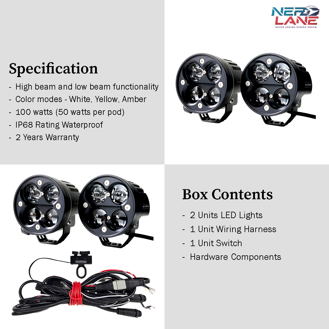 The Motorfans M4L Auxiliary Light is designed for maximum brightness, durability, and versatility, making it the perfect choice for adventure riders, touring enthusiasts, and off-road explorers. With a 100W power output (50W per pod), advanced dual-projector technology, and multiple beam & color options, this auxiliary light ensures enhanced visibility and safety in all riding conditions.