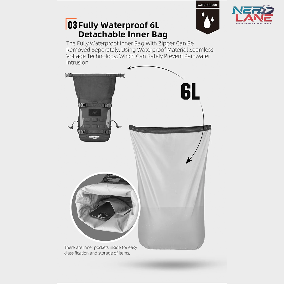 Each side-mounted bag offers 6L of waterproof storage, reinforced with semi-rigid PE board panels to maintain structure and shield your gear from impact. The fully waterproof, detachable inner bag ensures your belongings stay dry in all weather conditions. With a versatile MOLLE system, multiple mounting methods, and convertible carry options, these bags adapt effortlessly from tank, crash bar, or side rack use—on or off the bike.